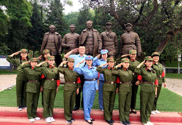 7日早上8点,12名党员小分队在枣园集结。盛夏的清晨,枣园里安静祥和,空气清新。这里曾是中共中央书记处驻地。在五书记(毛泽东、周恩来、刘少奇、朱德、任弼时)雕像前,全体党员重温入党誓词,齐唱革命歌曲,并向伟人雕像三鞠躬。随后小分队依次参观了小礼堂,毛泽东、周恩来、朱德等领导人旧居。伟人们简朴的生活环境,简单的生活生产用具,让人心生敬佩。战火纷飞的年代毛泽东同志除了指挥作战,还在枣园创作了大量的理论巨著。一个半小时远远不够用,小分队的同志们认真学,仔细听,纷纷在这里合影留念。