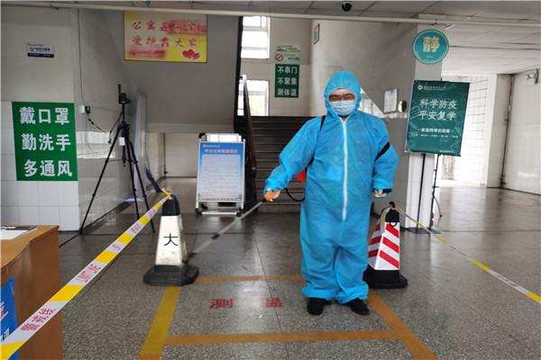 党员谭飞、郭线科在保洁员人手不足的情况下,主动背起药桶,充当消毒员的角色,对公寓进行全面消毒。