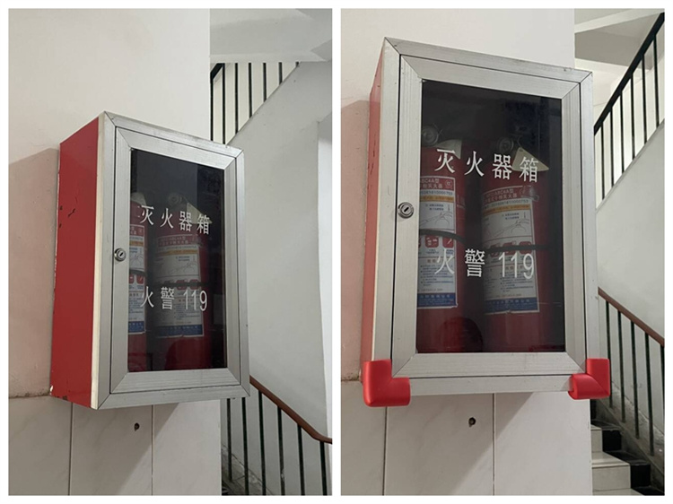 为在发生紧急情况时可以随时取用灭火器,有的公寓楼灭火器消防箱安装在楼道、楼梯拐角、门厅出入口墙上,而灭火箱铁质柜角比较坚硬锐利,有的学生在楼内出行时,不小心头部就会触碰到消防箱尖角,存有安全隐患。为防止类似事件发生,学生社区中心按照上级领导安全检查提出的整改要求,近期对10栋学生公寓楼安装在墙面上的共70个灭火器消防箱全部购置、安装了海绵防撞角,以细微之举切实保障学生在公寓楼内的安全。