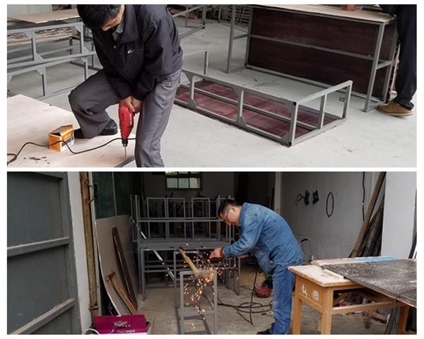 主席台上摆放的桌子已使用较长时间,使用频次高,现桌面出现了不同程度的掉皮、磨损现象。为节约资源、减少浪费,校园管理中心本着“物尽其用,变废为宝”的原则,拆除旧桌子,合理利用尚可利用资源,自购生态板、九厘板、万能胶等材料,通过焊接、固定、油漆等工序,对40张桌子进行了维修组装,现已全部完工。