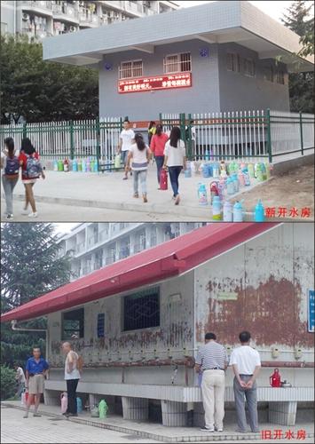 后勤服务中心经过前期精心筹划和安排,决定在今年暑假施工。相关部门冒着高温酷暑、坚守岗位、共同努力,按时保质地完成了拆除重建工程。此次拆除重建工程改原有的活动板房为砖混结构,对地面进行硬化,一定程度上消除了安全隐患;改原有的开水箱为开水加热器,增大了水箱容量,增强保温效果;更新一卡通刷卡系统26 个,并增加了10个备用水龙头,以备一卡通出现问题时使用;安装了30余米护栏,确保开水房更加安全、整洁。