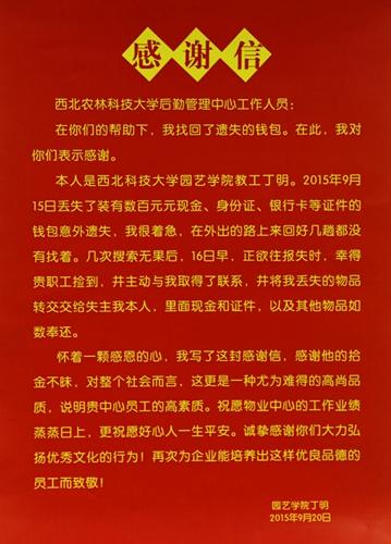 近日,物业中心收到一封感谢信,信中对陈喜华同志拾金不昧的行为表示感谢。