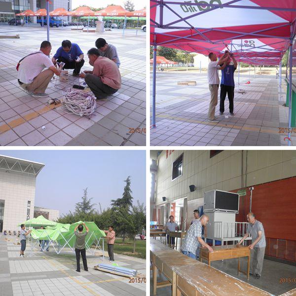 26日-28日,中心员工在负责人的带领下,完成了北校区绣山活动中心、火车站、火车南站、汽车站、学生西区等接待点58个接待棚搭建、200余套桌椅搬运摆放、棚内电源线路、80个插座、98个灯头、98个灯泡的安装。并加强新生接待期间的校园保洁力度,全面清扫教学楼、办公楼地面,清理卫生死角、野广告;清擦范围内楼体玻璃门窗等。集中力量对所属区域教学楼、办公楼水电、木泥维修进行检查与维修,为广大师生和学生家长营造了干净整洁的校园环境。
