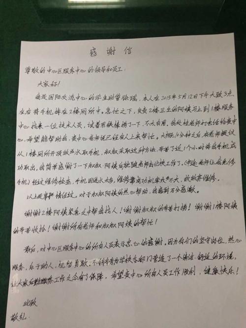 5月15日,中心区服务中心维修班收到来自我校学生助管的感谢信,信中她写到 “中心区工作人员热心服务、乐于助人、不辞辛劳”营造了一个清洁、舒适的环境。