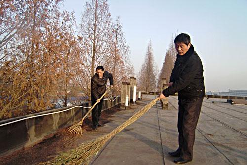 在清理过程中,他们有的用铁锨铲,有的用手锯,有的用扫帚扫,有些地方工具无法使用,他们就蹲下来,直接用手指来清理……。经过一周的清理,学生东区9栋公寓楼屋面焕然一新,屋面落叶垃圾得到及时清理,既美化了学生居住环境,又消除了安全隐患。