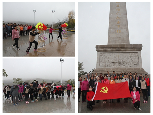 参观完后,大家佩戴着党徽来到纪念碑前,向革命英雄纪念碑敬献花篮并鞠躬致意,面向党旗,举起右拳,共宣入党誓词。