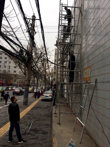 经工程人员多次现场查看,最终落实维修方案。3月23日一早,施工人员搭建起脚手架,攀登到距离地面七八米高的位置,对瓷砖脱落位置进行维修,将开裂瓷砖铲除清理后,用水泥砂浆将墙面抹平。除了完成墙面修复,施工人员还对墙面其他瓷砖进行仔细检查,彻底消除安全隐患。