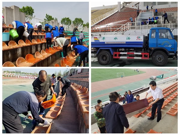 春季运动会召开在即,校园管理中心充分做好会场准备工作,对田径场进行了全面检修、清理,并布置会场。组织维修人员对田径场内四周看台座椅进行逐一检查,共加固、维修座椅100余个;调配疏通车、洒水车、洗扫车对田径场地及看台座椅进行了全方位冲洗,确保了运动场地的整洁、干净;组织员工搬运并固定主席台桌子30张,座椅60把,摆放标语背板14块;对运动场内的12个卫生间进行了系统检修和清理。此外,在运动会期间,校园管理中心将派专人对运动场环境卫生进行清理,确保给运动会提供一个干净整洁的场地。
