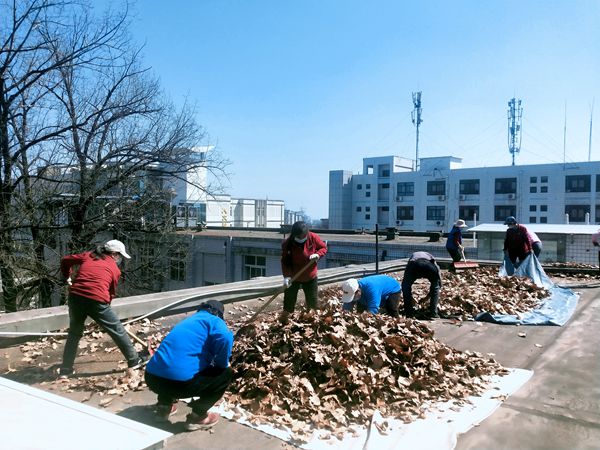 集中清理,促使楼顶环境面貌改观。3月29日至4月2日,校园管理中心合理调整作业时间,南、北校区集中全部人力,拿着提前备好的耙子、扫帚、笤帚、垃圾桶、簸箕等工具登上楼顶,对所辖楼宇楼顶杂物进行了集中清理,下水口淤泥进行了仔细疏通,水泥缝隙杂草进行了彻底清除,为广大师生营造了安全、和谐、舒适的学习工作生活环境。