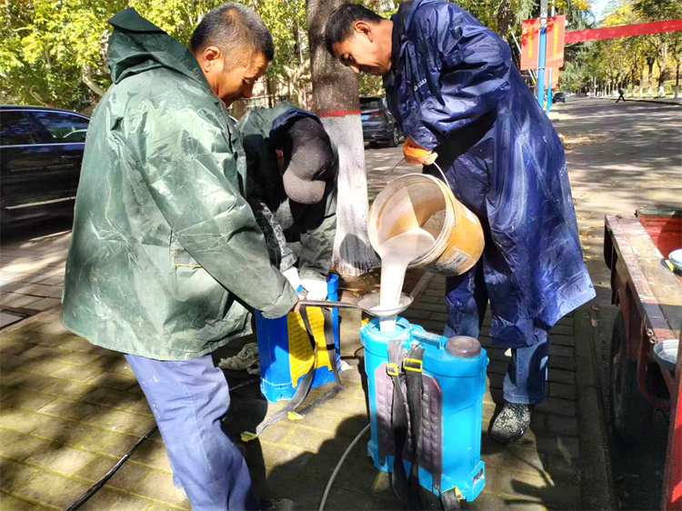 树木涂白是入冬前为树木进行养护管理的一项重要内容,也是每年必做的工作。涂白剂的主要原料为石灰和石硫合剂,具有杀菌、防止病菌感染和保暖的作用,能够消灭树皮内越冬的虫卵和蛀干害虫,提前预防病虫害,减少越冬病源和虫源,从而提高园林树木的抗病和抗寒能力,并加速伤口愈合;树干涂白后,能够使40%-70%的阳光被反射掉,降低昼夜温差带来的树木开裂,同时,可延迟果树萌芽和开花期,防止早春霜害,确保树木健康生长。