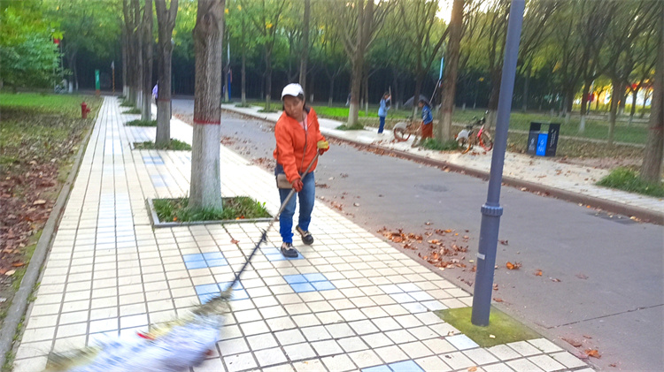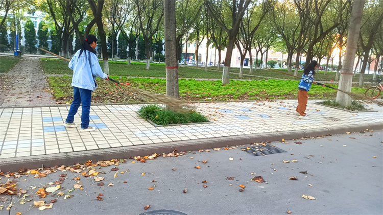 这两个女孩其实是校园环境中心室外保洁员石创利的孩子,姐姐上初一,妹妹上六年级。石创利已经在保洁一线工作了5年,主要负责每日清扫南校区3号教学楼前及周边区域约400米长的道路。由于近期降温并伴随着刮风,校园道路落叶量增加,而且正值周末,天气也不错,于是,她就萌生了叫孩子们跟她一起清扫校园的想法。