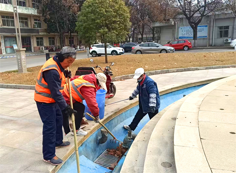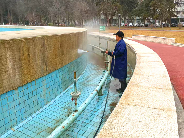 校园水景观一直是校园环境建设的关键部分,深受师生们的关注。每至冬季,为防止低温结冰对泵体和管道造成损坏,校园环境中心湖池管理员就将喷泉池及管道内的水放光、排净。经过几个月的停用,雨雪和大风等天气使得池内积攒了不少淤泥、落叶和杂物。为确保喷泉在春季能够正常运转,入春后校园环境中心重新启用喷泉前,都需要对喷泉池进行一次全面清洗维护,重点清理沉降在池底的污渍杂物、淤泥,以及池壁的污垢,同时,对局部损坏、老化设备和零件进行更换和调试,保证设备的安全性和稳定性。