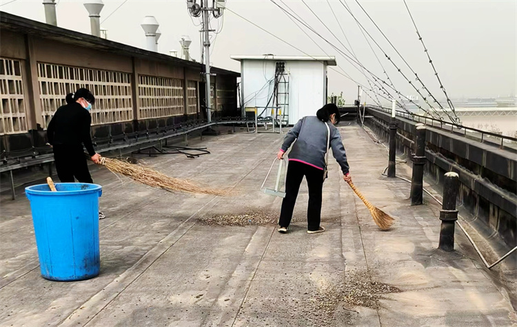 在各班组长的统一安排下,大家拿着铁锨、扫帚、袋子、垃圾桶等工具小心登上楼顶,对楼顶枯枝落叶、淤泥、砖块等杂物采取“地毯式”进行彻底清理。大家两三人一组,分工明确、齐心协力,有人徒手清理杂物、有人拔草、有人挥舞扫帚,在狭窄的设备缝隙、水洼里、尘土里都留下了大家辛勤劳动的身影和汗水。大家不放过任何一个角落,尤其是针对楼顶垃圾死角,确保排水口干净无塞堵,同时对产生的杂物随清随运,不留积存。