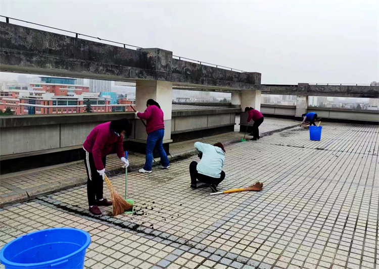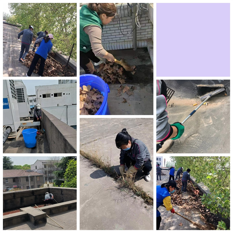 楼顶杂物堆放、落叶落花堆积容易造成雨水排放不畅,导致屋顶渗水、漏水和外墙脱落,影响房屋的安全性和美观度。为做好这一项工作,中心高度重视,先是组织管理人员对所辖楼宇进行排查,登记,随后全面统筹中心日常业务工作,按照安全为原则对要清理的楼宇进行了划分,人员进行合理调配,通过一周时间集中中心全部人力、物力对南北校区部分办公楼、教学楼楼顶进行了专项清理活动。