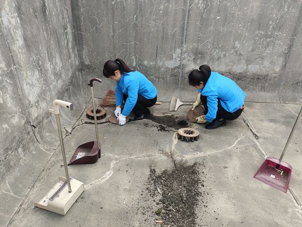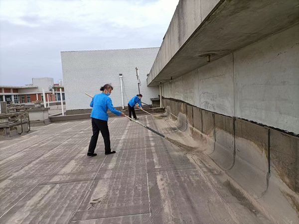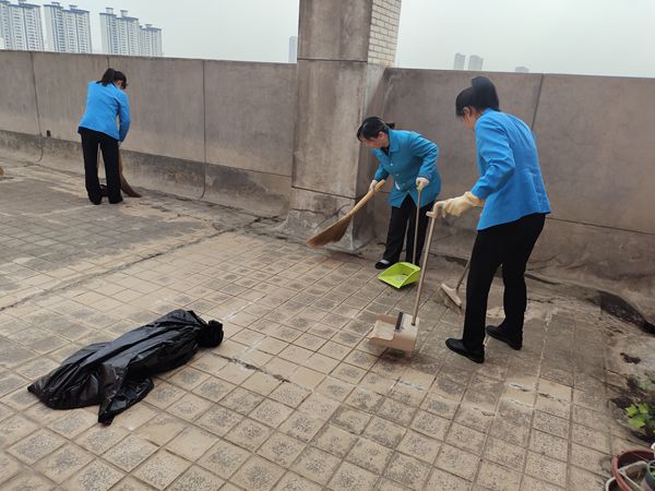 两人一组,三人一堆,保洁人员有的人拿着扫帚、有的人撑着袋子、有的人拿着簸箕,大家积极主动,配合默契,发扬不怕苦、不怕累的精神,认真清扫楼顶平台上的沙土、小石头、生活垃圾、杂物等,并对落水管道周围的泥土和沙石进行疏通、清理,保证落水管道排水通畅。经过两个半天时间的清扫,平台卫生焕然一新。