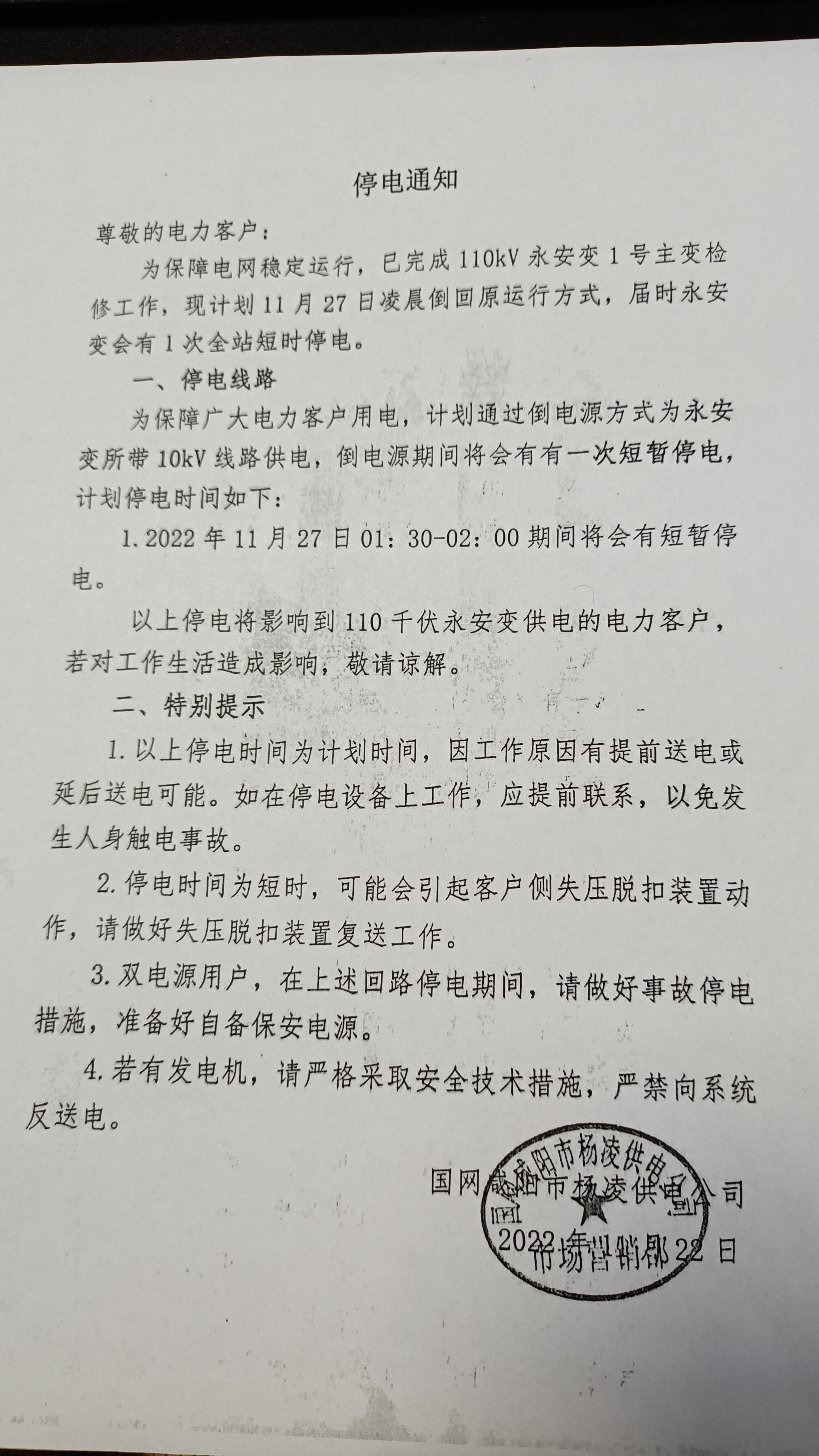 接杨凌示范区供电公司通知,计划于11月27日对110KV永安1号主变进行检修,在此期间将导致我校南校区部分用电单位短暂停电,停电时间及区域通知如下: