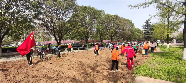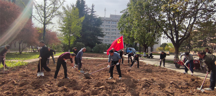 下午3点,党员职工们已全员到达现场,在领取劳动工具后,纷纷在各自的划分区域内忙碌起来。在校园环境中心“技术员”的指导下,挥锹铲土、搬运花种、挖坑种植、培土压实,各个环节衔接有序,一气呵成。大家各司其职、默契配合,高高飘扬的党旗下伴着党员们热火朝天的劳动身影……经过一下午的辛勤劳动,4000余平方米美人蕉被整齐的栽种在土壤里。大家共同植绿、护绿,以“党旗红”赋能校园“生态绿”建设。