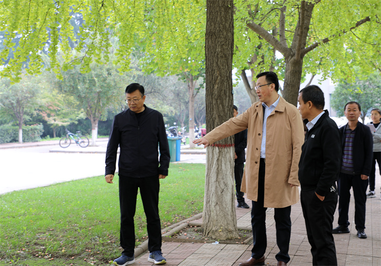 郑英宁一行先后实地勘察了南校区1号教学楼、通勤车停靠点、经管学院、银杏路、梧桐路、学生生活区、柳荫大道等地周边环境,通过现场勘察、听取汇报、分析研讨,详细了解有关自行车停放、人行道改造、乔木修剪及坑基改造、电动自行车充电桩、停车场扩建等改造方案,认真了解推进情况和推进过程中遇到的问题,并对各项目建设提出了针对性指导意见。同时,郑英宁走进学生公寓值班室,听取了值班员工作汇报,查看了学生公寓人脸识别系统,详细了解了学生公寓智能化建设情况;郑英宁一行走到柳荫大道,绿化工正在修剪柳树,听取了有关下一步管护方案和计划。