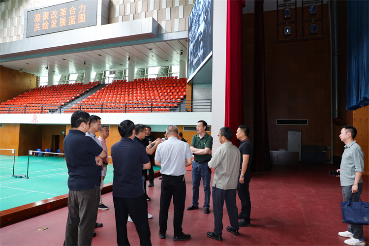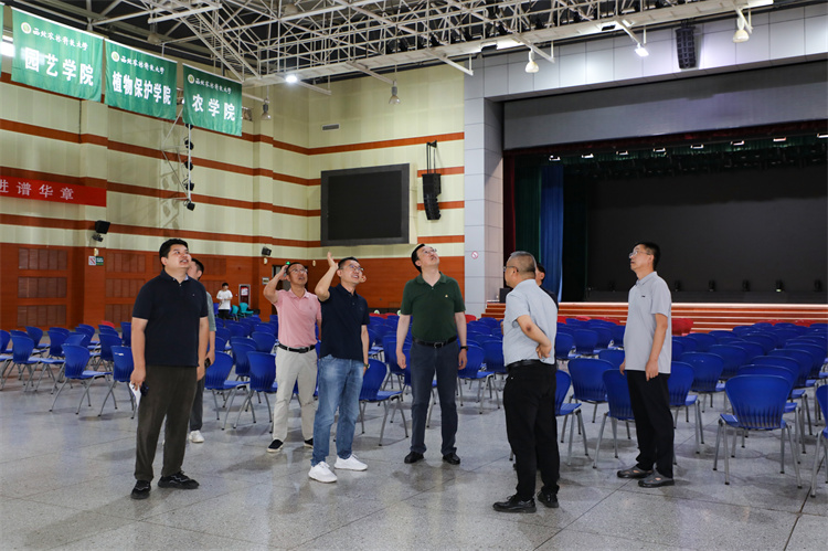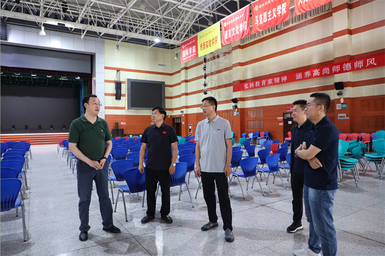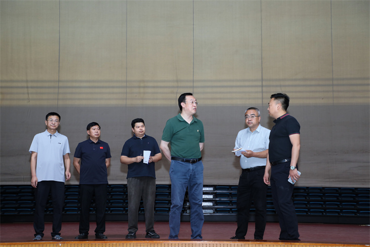 郑英宁一行重点检查了两处场地的舞台搭建、毕业生入场线路、观众席布置、灯光音响设备及氛围营造方案。在体育馆舞台,他现场确认了音响等电子设施准备情况,听取背景板位置与氛围营造汇报;在北绣山活动中心观众席,他叮嘱要考虑到高温天气,增加降温设施,确保毕业生和观礼家长舒适安全。